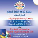 شركة النفط بعدن تعلن عن خصم ١٤٪ لمدة ٣ ايام تزامناً مع احتفالات الشعب اليمني بالذكرى الـ 62 لثورة الـ 14 من أكتوبر المجيدة، أعلنت شركة النفط الي...