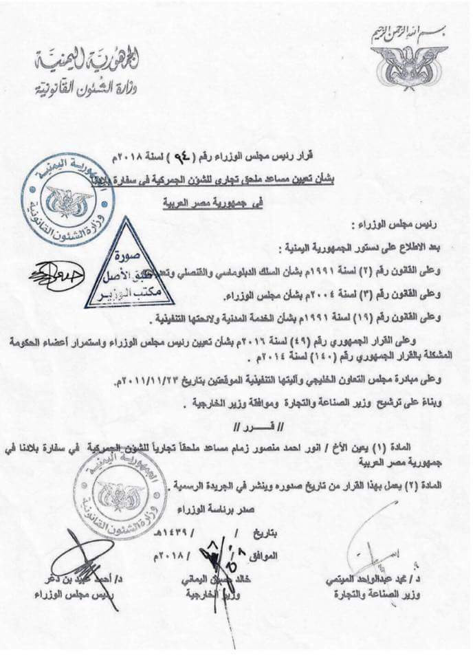 اصدر رئيس الوزراء احمد عبيد بن دغر قرارا يقضي بتعيين نجل محافظ البنك المركزي زمام مساعد للمحلق التجاري للشؤون الجمركية لسفارتنا في مصر.