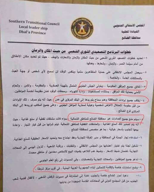 ويوم امس اصدر المجلس الانتقالي فرع الضالع قرارا قضى بمنع ارسال ايرادات المحافظة الى النبك المركزي بالاضافة الى عدم ارسال البضائع الى الشمال