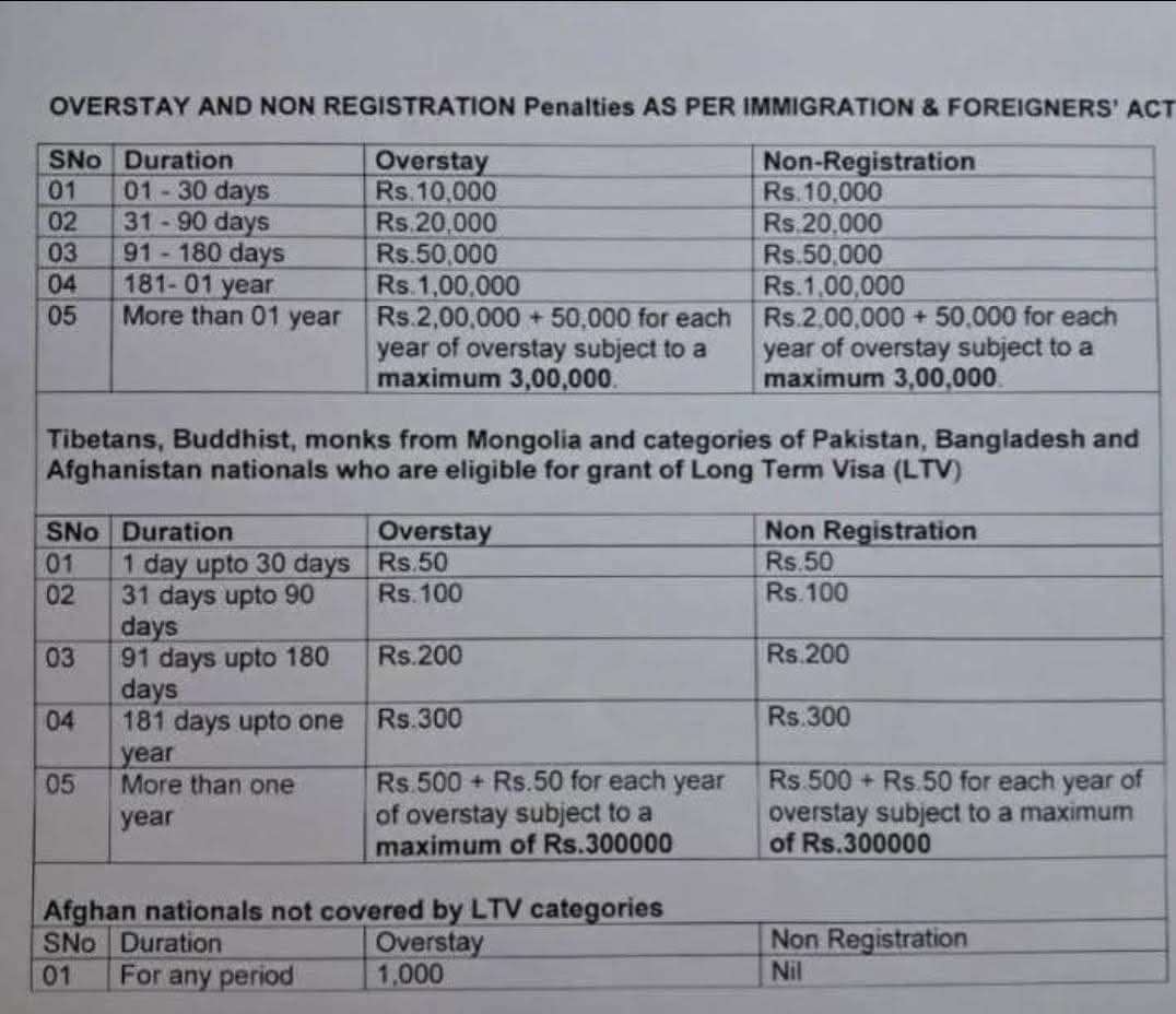 واضاف:و ستبداء الغرامات بمبلغ ١٠٠٠٠ روبية لمن كسر الإقامة من يوم واحد الى ٣٠ يوماً ثم تتزايد بحسب فترة الكسر حتى تصل الى مبلغ ٣٠٠٠٠٠ روبية لمن تجاوز فترة عام كامل