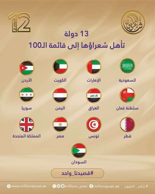أعلنت لجنة تحكيم برنامج "شاعر المليون" في موسمه الثاني عشر عن تأهل شعراء من 13 دولة عربية إلى قائمة المئة، وذلك بعد اجتيازهم مراحل الاختبارات التحريرية والشفهية التي أقيمت في العاصمة الإماراتية أبوظبي.