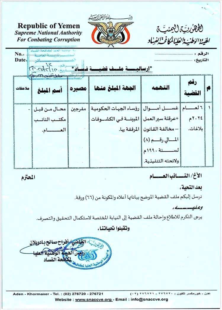 كشف تقرير رسمي صادر عن الهيئة الوطنية لمكافحة الفساد في اليمن عن فضيحة مالية وإدارية واسعة، مؤكدًا أن 204 مؤسسة حكومية لا تلتزم قانونًا بتوريد إيراداتها إلى البنك المركزي. هذا الكشف يضع علامات استفهام كبرى حول حجم الفساد المستشري وطريقة إدارة المال العام في البلاد