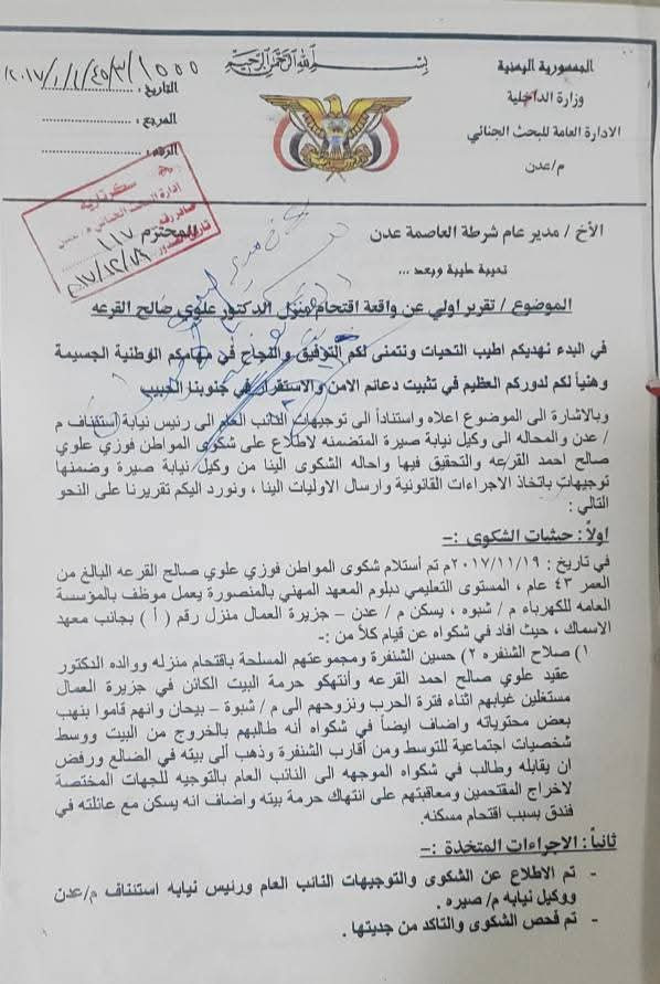 وبحسب وثيقة رسمية بتوقيع مدير البحث الجنائي في عدن بعام ٢٠١٧م جاء فيها