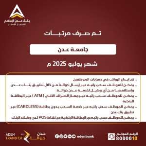 أعلنت إدارة جامعة عدن اليوم عن صرف مرتبات شهر يوليو 2025م لجميع موظفيها وأعضاء الهيئة التعليمية والإ...