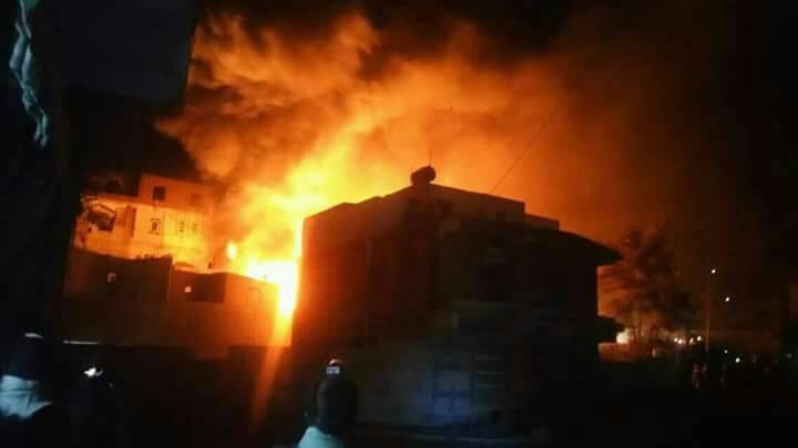 شب حريق ضخم قبل قليل في مخزن ديزل التابع لمخبز اللواء الاخضر في حي مذبح بالعاصمة صنعاء.