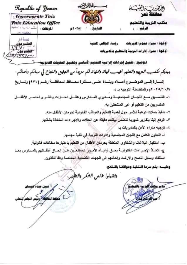 حيث وجّه مكتب التربية والتعليم مديري المديريات بتفعيل إجراءات "إلزامية التعليم" واتخاذ العقوبات القانونية بحق المتخلفين، مع تنفيذ حملات توعية لحث الأسر على تسجيل أبنائها.