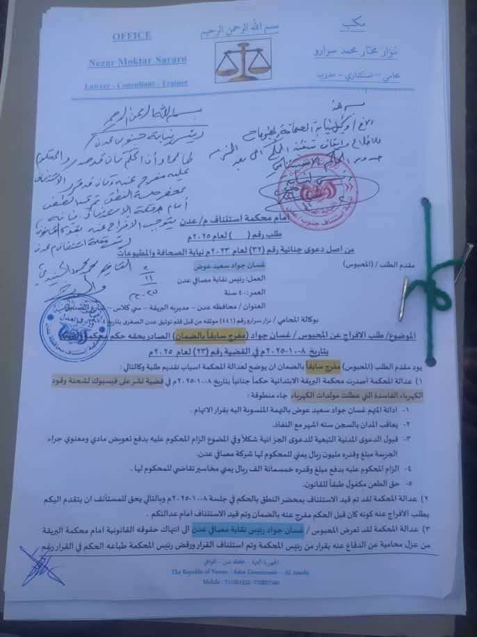افادت مصادر لكريتر سكاي باطلاق سراح رئيس نقابة مصافي عدن الاستاذ غسان جواد اليوم .
