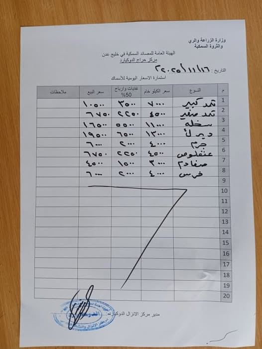 أعلنت الهيئة العامة للمصائد السمكية في عدن عن استقرار أسعار الأسماك الأحد ١٦ نوفمبر ٢٠٢٥م ، مع تفاوت بسيط في بعض الأصناف