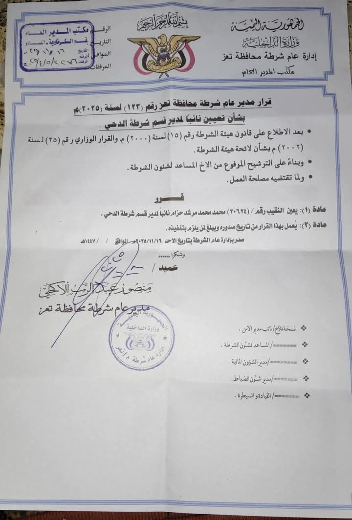 أصدر مدير عام شرطة محافظة تعز قرارًا بتعيين الفندم محمد المرشدي نائبًا لمدير قسم الدحي، في خطوة تعكس الثقة بكفاءته العالية وإخلاصه في أداء مهامه.