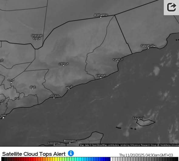 تشير خرائط الطقس ليوم الخميس 20 نوفمبر 2025م إلى أن معظم مناطق اليمن والشرق الأوسط ستشهد أجواء صحوة ومستقرة دون هطول أمطار، باستثناء أرخبيل سقطرى الذي يُتوقع أن يشهد أمطارًا خفيفة إلى متوسطة خلال فترات متقطعة من الصباح وحتى ساعات المساء والليل.