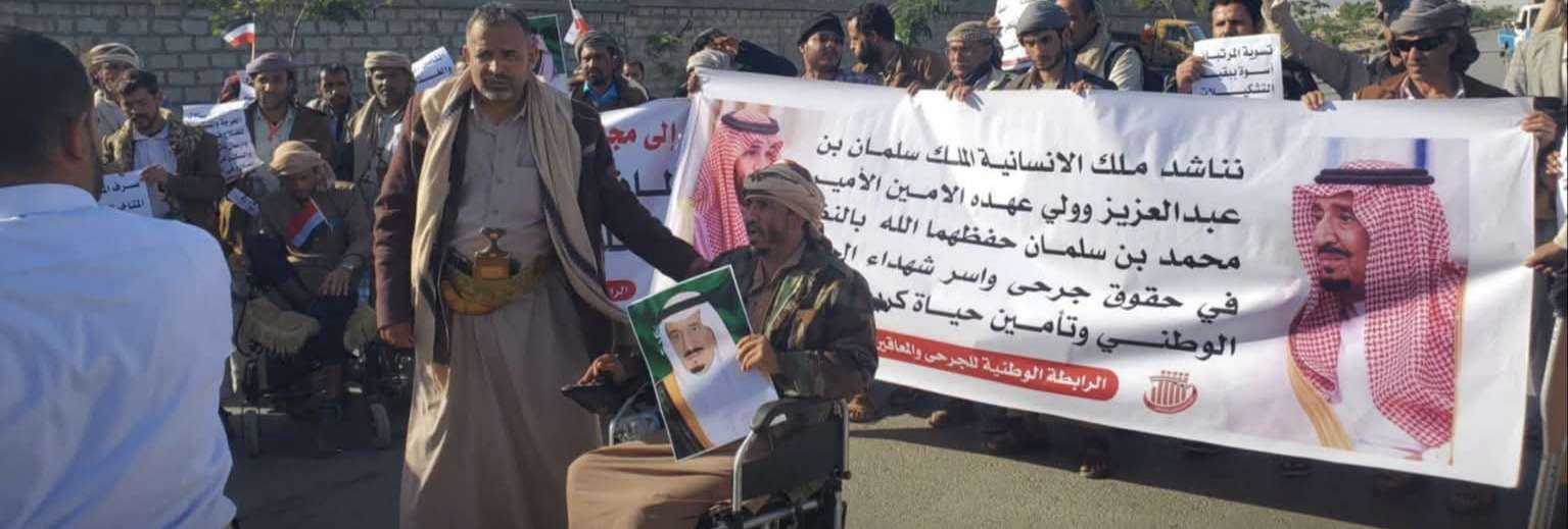 ورفع المشاركون لافتات تناشد القيادة السعودية بالتدخل، ورددوا هتافات تندد بصمت الحكومة وتجاهل مطالبهم المتعلقة بالعلاج والرعاية والمرتبات ومساواتهم بجرحى التشكيلات العسكرية الأخرى..