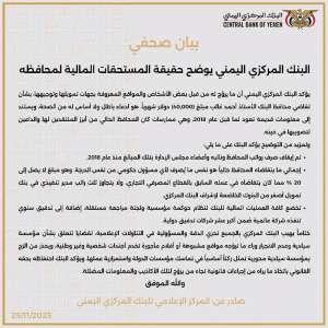 أكد البنك المركزي اليمني أن ما يروَّج له من قبل بعض الأشخاص والمواقع المعروفة بجهات تمويلها وتوجيهها...