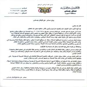 أصدرت قبائل جساس بمحافظة المهرة بيانًا أكدت فيه موقفها الوطني الثابت والداعم للشرعية الد...