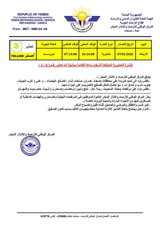 أصدر المركز الوطني للأرصاد والإنذار المبكر، اليوم الأربعاء، النشرة التحذيرية رقم (6/1)، منبهاً من موجة برد شديدة وتبريد واسع سيجتاح معظم المحافظات اليمنية خلال الـ 24 ساعة القادمة.