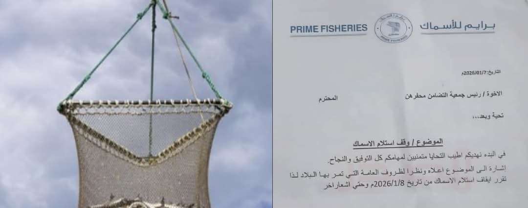 وقالت الشركة في بيان إنه و"نظراً للظروف العامة التي تمر بها البلاد، تقرر إيقاف استلام الأسماك من تاريخ 2026/1/8م وحتى إشعار آخر".