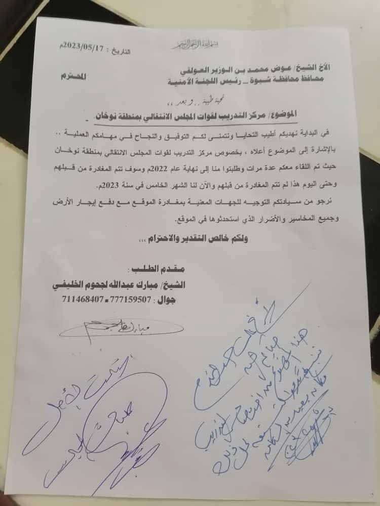 جدد أهالي وسكان منطقة "نوخان" التابعة لمديرية عتق بمحافظة شبوة، مناشدتهم لمحافظ المحافظة ورئيس اللجنة الأمنية، الشيخ عوض محمد بن الوزير، بضرورة التدخل العاجل لنقل معسكر اللواء الخامس من أطراف منطقتهم السكنية.