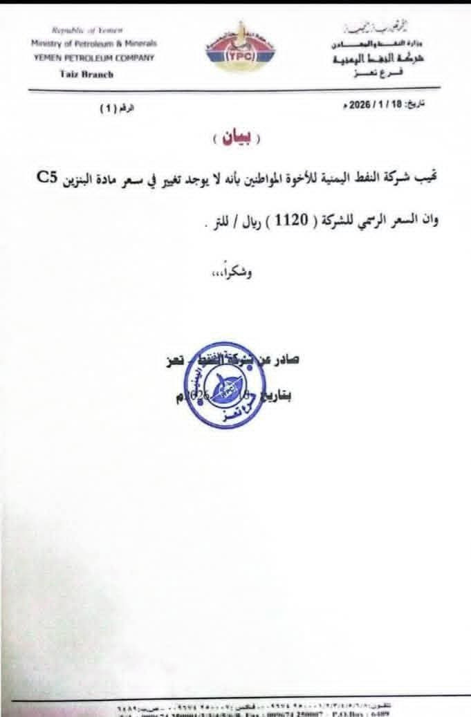 أصدرت شركة النفط فرع تعز تنويه هام الليلة بشأن حقيقة تغيير سعر مادة البنزين