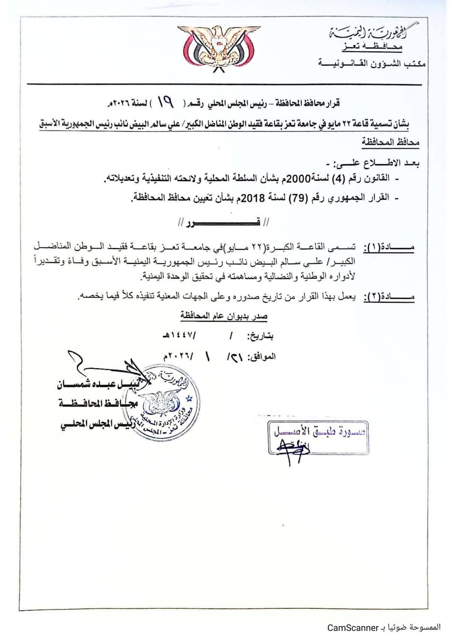 أصدر محافظ محافظة تعز، الأستاذ نبيل شمسان، قراراً يقضي بتغيير اسم "قاعة 22 مايو" الكبرى بجامعة تعز، لتصبح باسم قاعة المناضل الكبير علي سالم البيض.