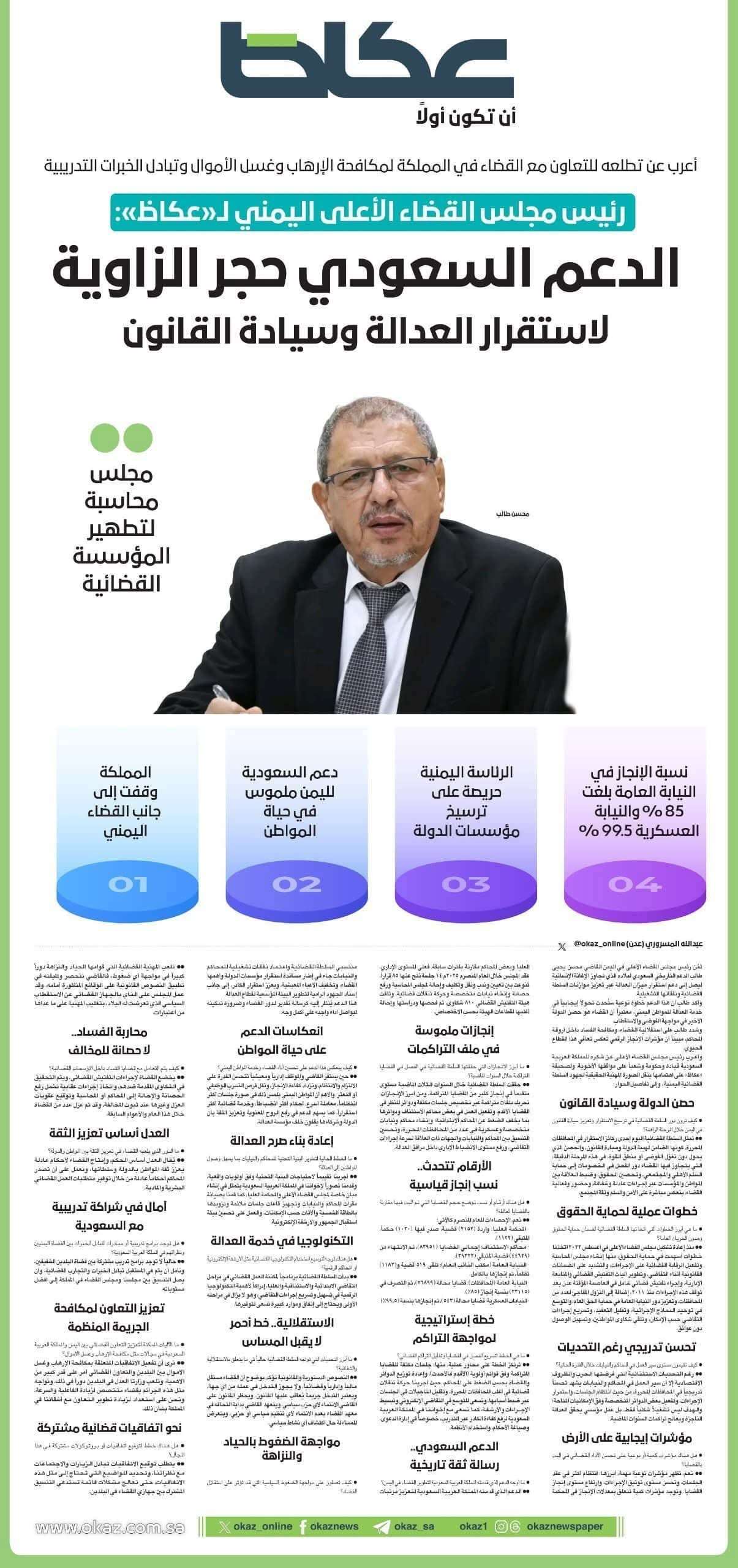 وأعرب رئيس مجلس القضاء الأعلى عن شكره للمملكة العربية السعودية قيادة وحكومة وشعباً على مواقفها الأخوية، ولصحيفة «عكاظ» على اهتمامها بنقل الصورة المهنية الحقيقية لجهود السلطة القضائية اليمنية.. وإلى تفاصيل الحوار: