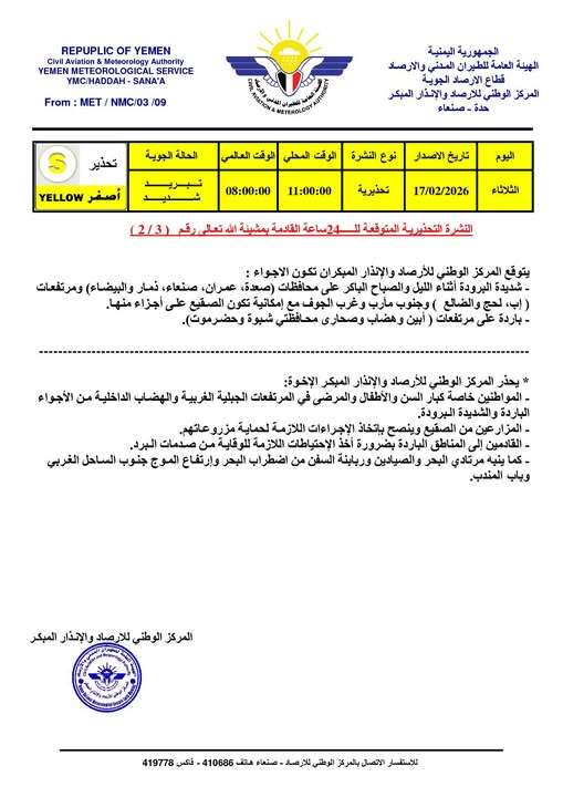 ونبّه كذلك القادمين إلى المناطق الباردة بضرورة الوقاية من صدمات البرد، إضافة إلى تحذير مرتادي البحر والصيادين وربابنة السفن من اضطراب البحر وارتفاع الموج جنوب الساحل الغربي وباب المندب.