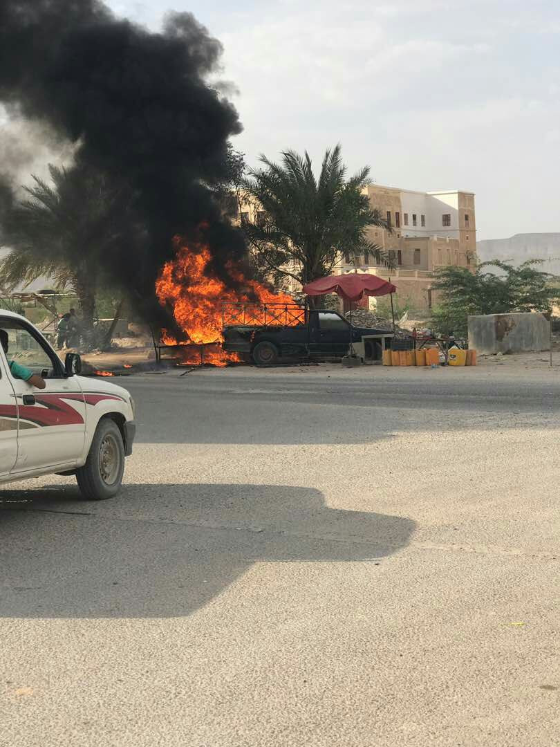 وقال شهود عيان ان سيارة احد بائعي مادة البترول والديزل في السوق السوداء احترقت في جولة شبام.
