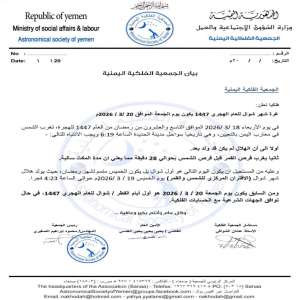 أعلنت الجمعية الفلكية اليمنية أن يوم الجمعة 20 مارس 2026 سيكون فلكيًا غرة شهر شوال لعام 1447هـ وأول...