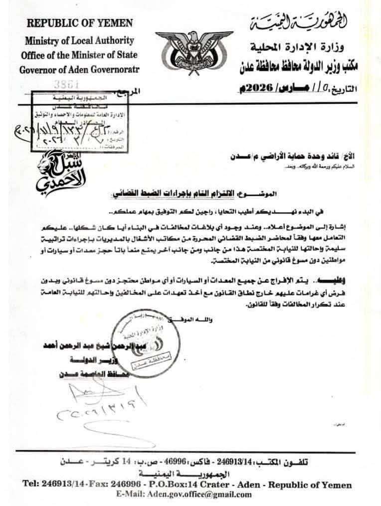 وتأتي هذه التوجيهات في إطار تنظيم عمل وحدة حماية الأراضي وضمان تطبيق القانون ومنع أي تجاوزات قد تحدث أثناء التعامل مع قضايا البناء والمخالفات في العاصمة عدن.