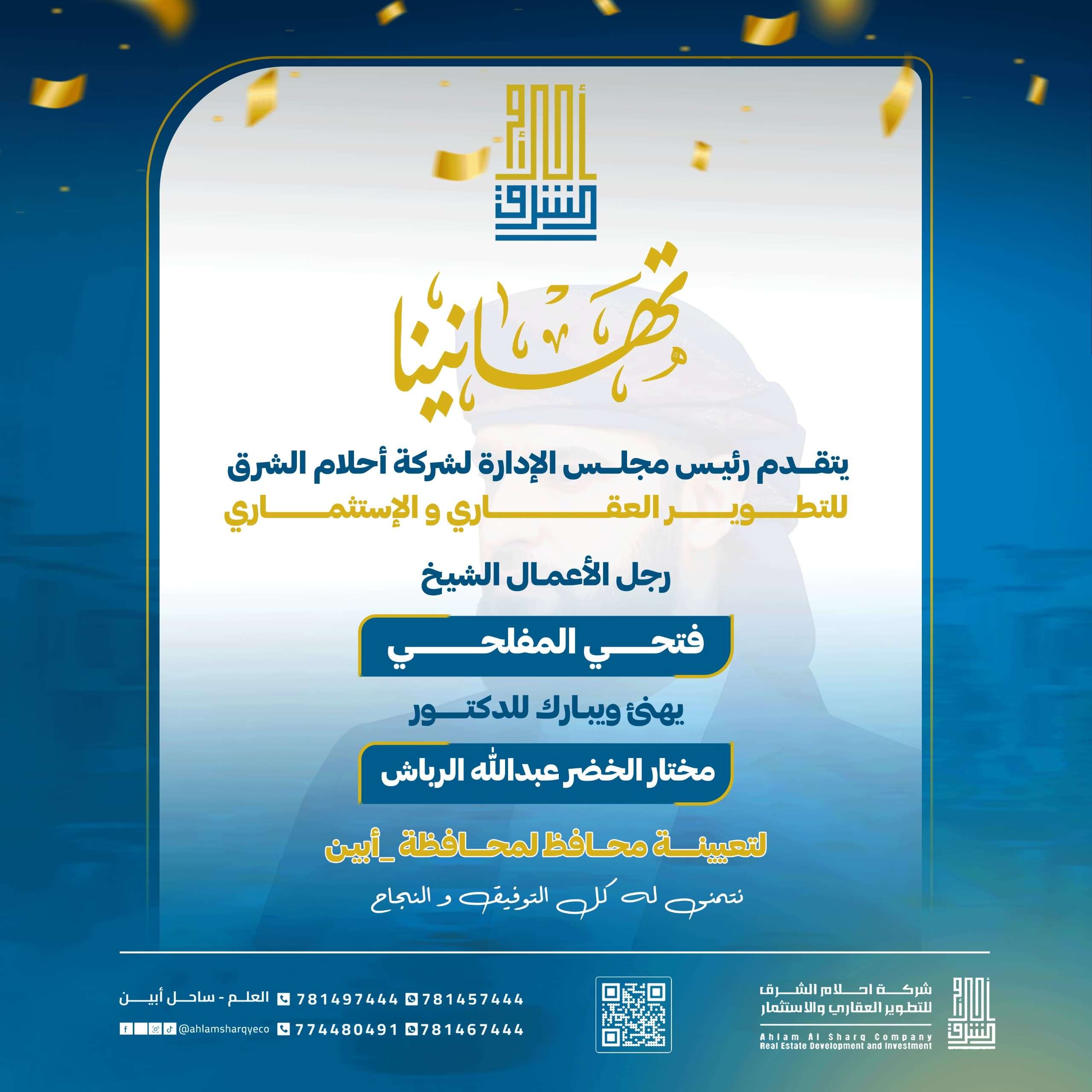تقدّم رئيس مجلس إدارة شركة أحلام الشرق للتطوير العقاري والاستثماري، رجل الأعمال الشيخ فتحي المفلحي، بأسمى آيات التهاني والتبريكات للدكتور مختار الخضر عبدالله الرباش، وذلك بمناسبة تعيينه محافظًا لمحافظة أبين.