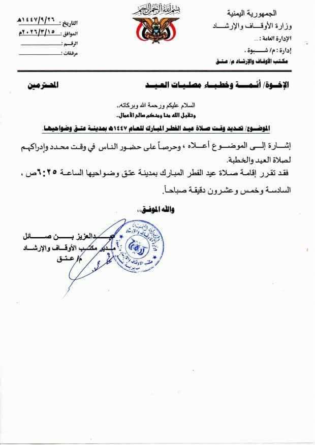 أعلن مكتب الأوقاف والإرشاد في مدينة عتق بمحافظة شبوة عن تحديد موعد إقامة صلاة عيد الفطر المبارك لعام 1447هـ في المدينة وضواحيها.