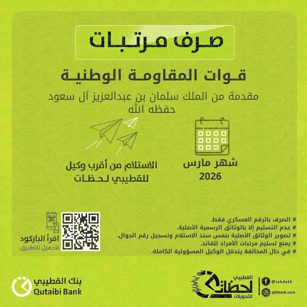 أعلن بنك القطيبي الإسلامي بدء صرف مرتبات قوات المقاومة الوطنية، وقوات النخبة الحضرمية والأمن بساحل حضرموت لشهر مارس 2026، بدعم كريم من خادم الحرمين الشريفين الملك سلمان بن عبدالعزيز آل سعود – حفظه الله.