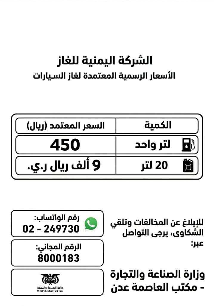 أعلنت وزارة الصناعة والتجارة – مكتب العاصمة المؤقتة عدن، عن الأسعار الرسمية المعتمدة لغاز السيارات، داعية المواطنين والتجار إلى الالتزام بها والإبلاغ عن أي مخالفات.