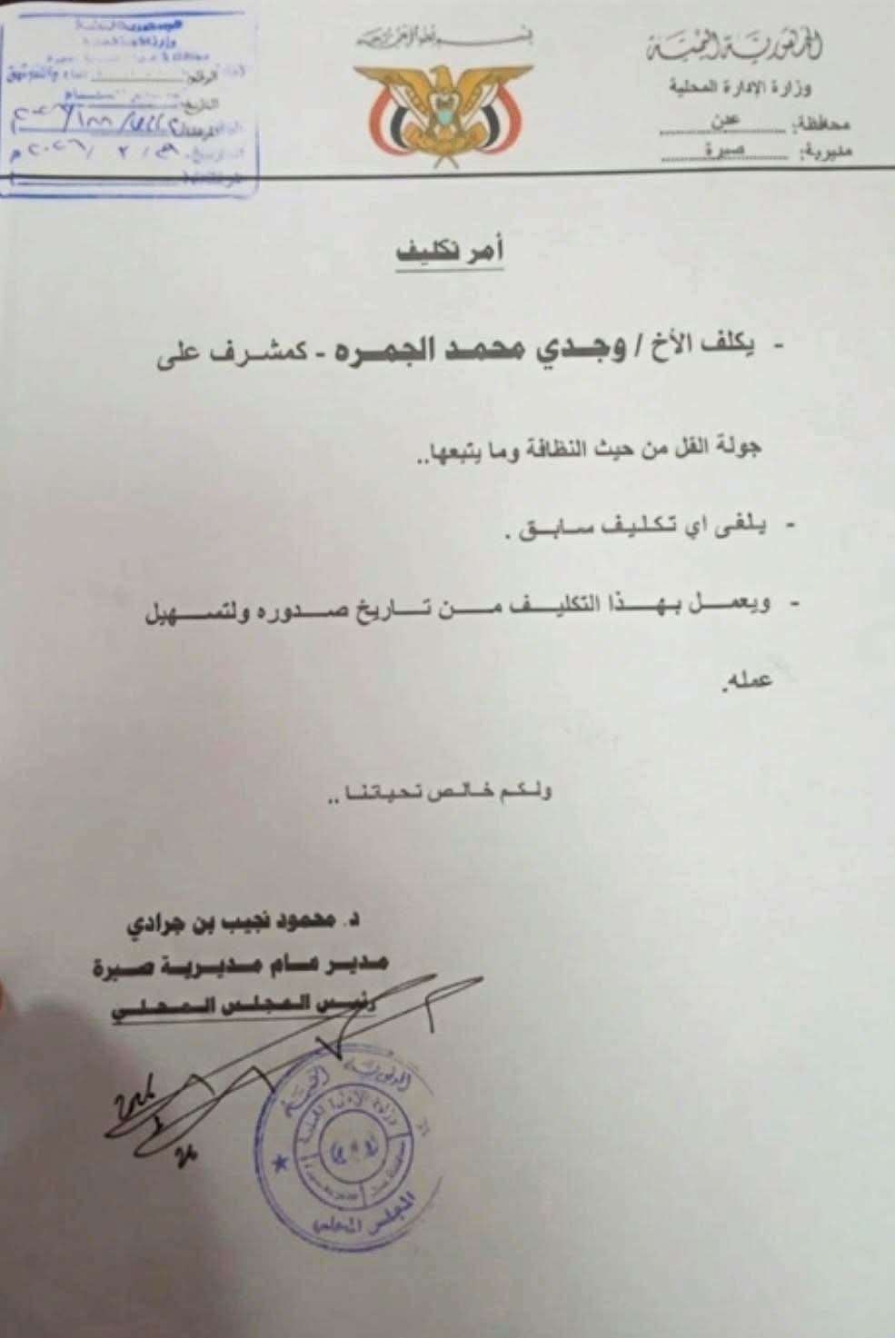 صدر قرار إداري بتكليف وجدي محمد الجهوري للعمل كمشرف على جولة النقل من حيث النظافة وما يتبعها، في مديرية صيرة بمحافظة عدن.