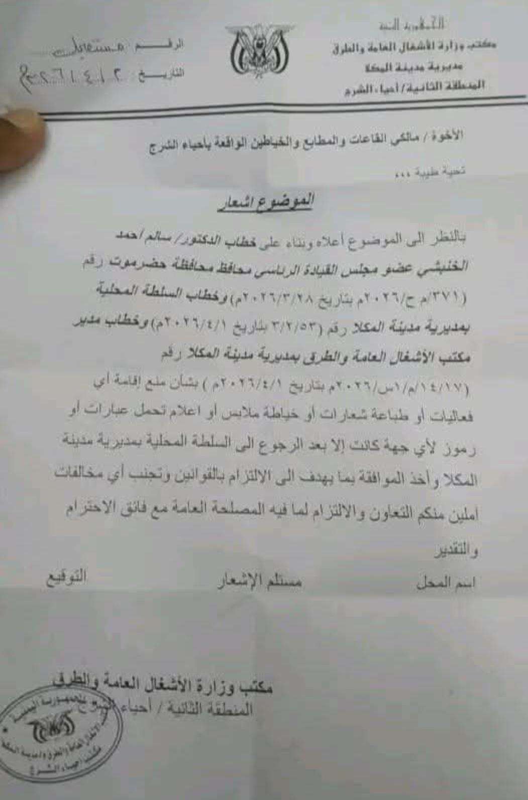 أصدرت السلطات المحلية بمديرية مدينة المكلا تعميماً رسمياً للقاعات والمطابع والخياطين يقضي بمنع استضافة أو طباعة أو خياطة أي شعارات أو أعلام لأي جهة كانت.