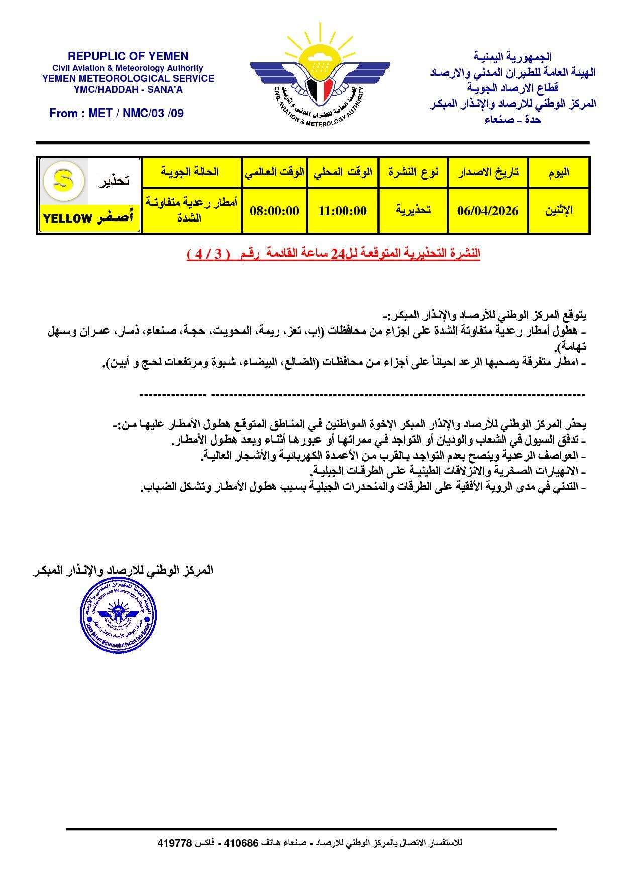 توقع المركز الوطني للأرصاد والإنذار المبكر هطول أمطار رعدية متفاوتة الشدة خلال الـ24 ساعة القادمة على عدة محافظات يمنية.