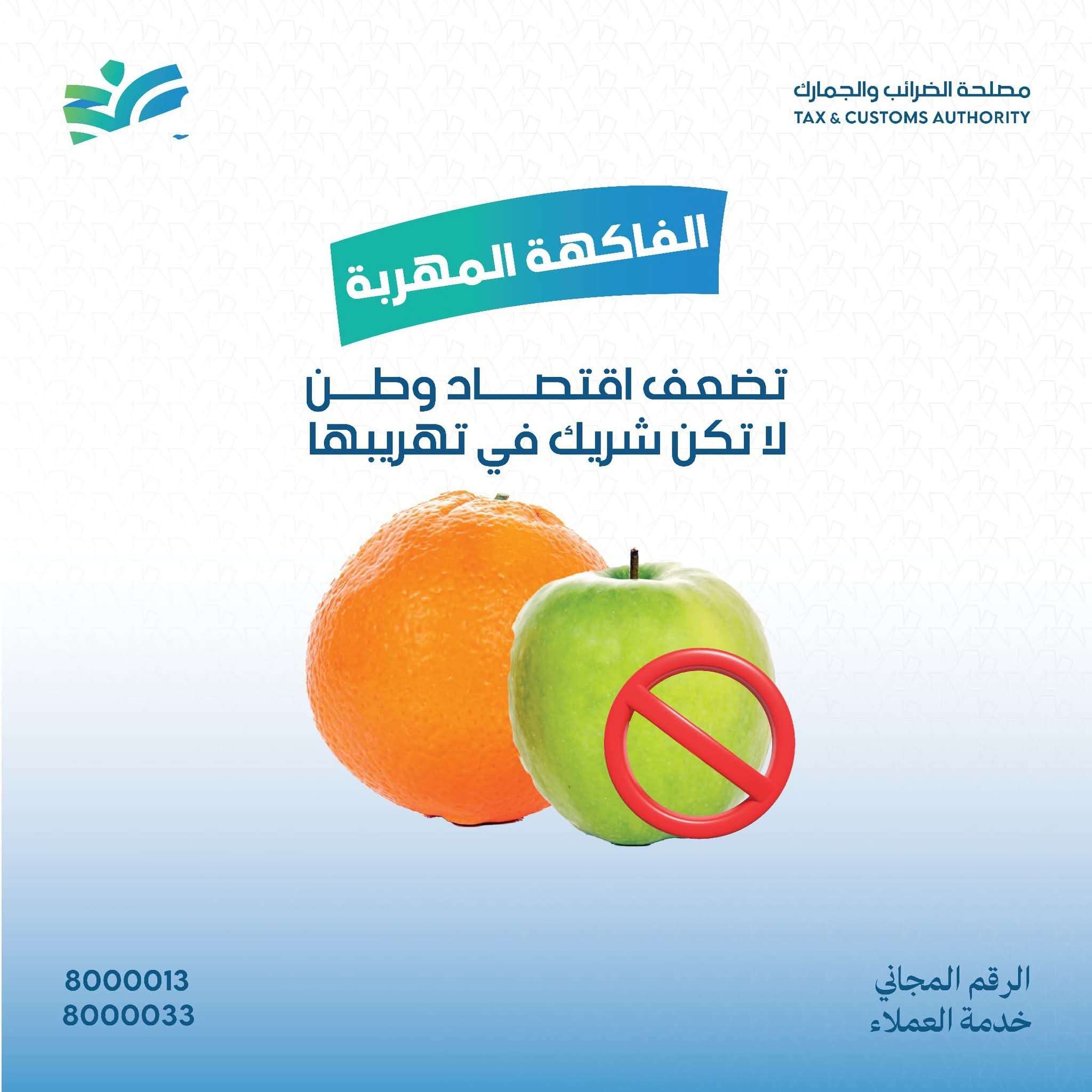 أعلنت مصلحة الضرائب والجمارك أن فاكهة البرتقال والتفاح ممنوعة من الدخول إلى المحافظات الحرة، في إطار حملة تهدف إلى حماية المنتج المحلي وتشجيع استهلاك الفواكه الوطنية.