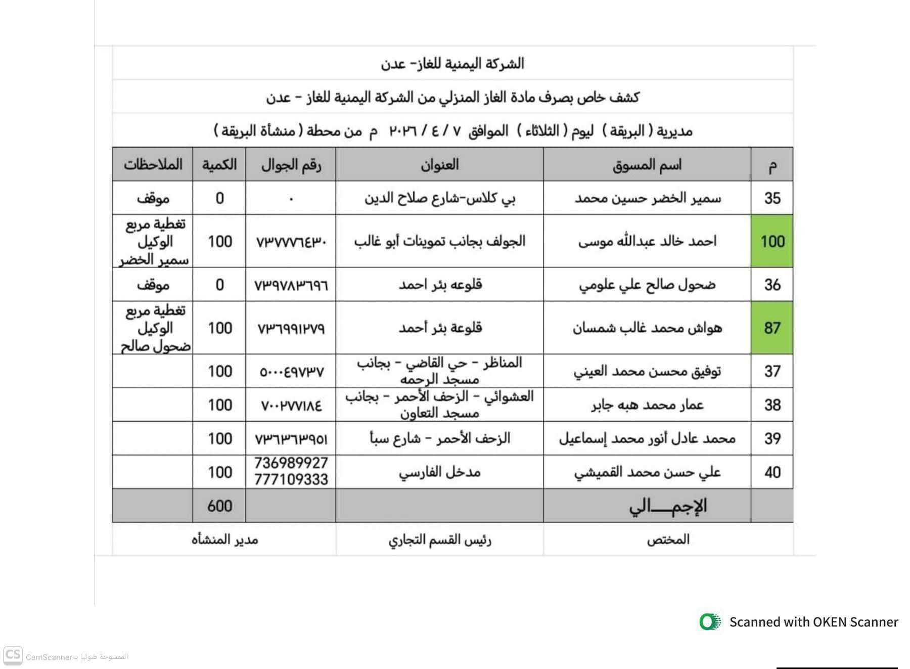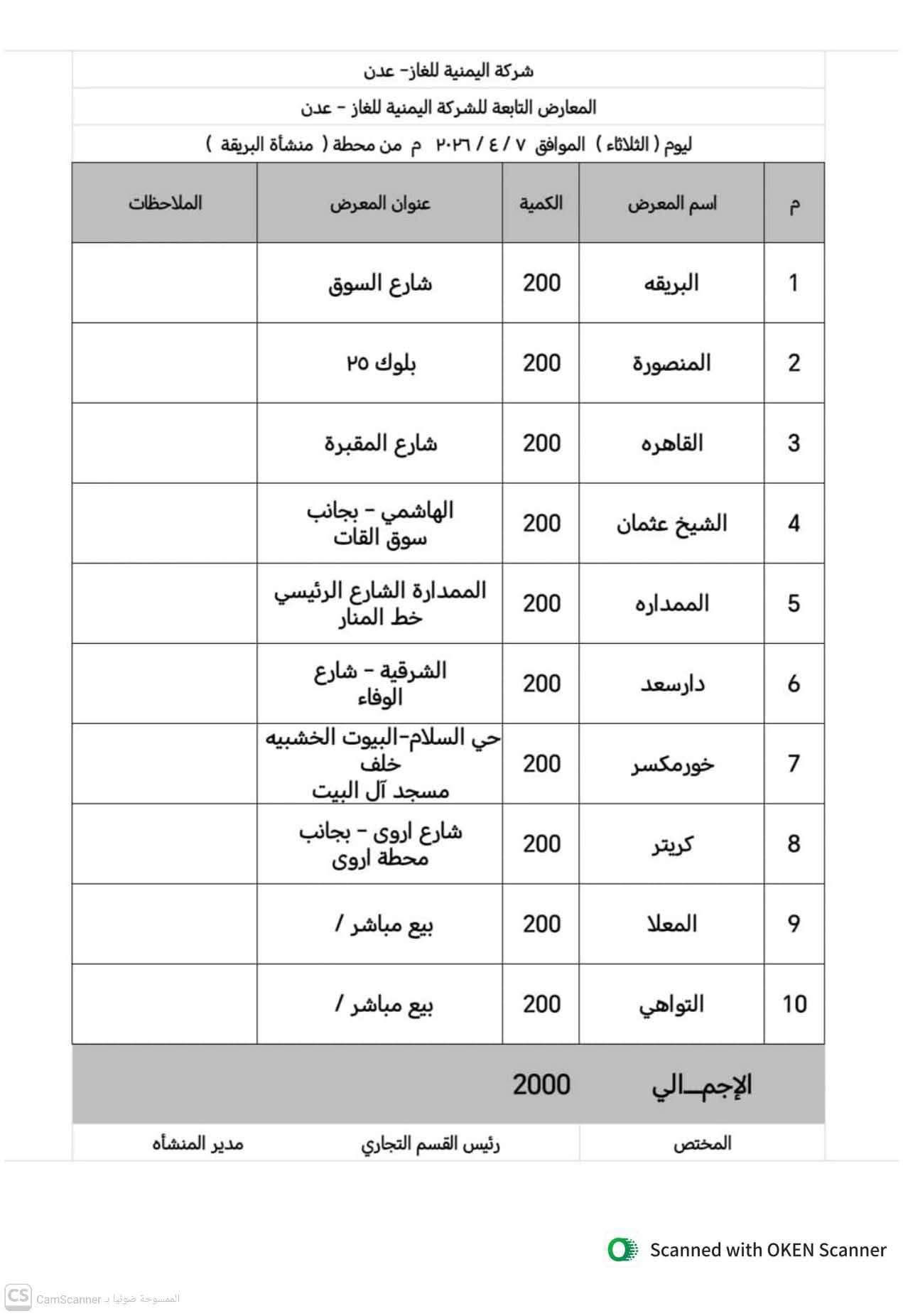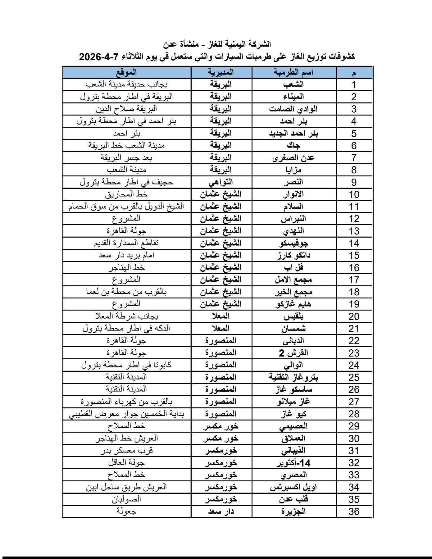 أعلن المكتب الإعلامي بمديرية البريقة عن نشر كشوفات توزيع مادة الغاز، الخاصة بتموين طرمبات السيارات وأسطوانات الغاز المنزلي في مديريات العاصمة عدن، وذلك ليوم الثلاثاء الموافق 7 أبريل 2026.