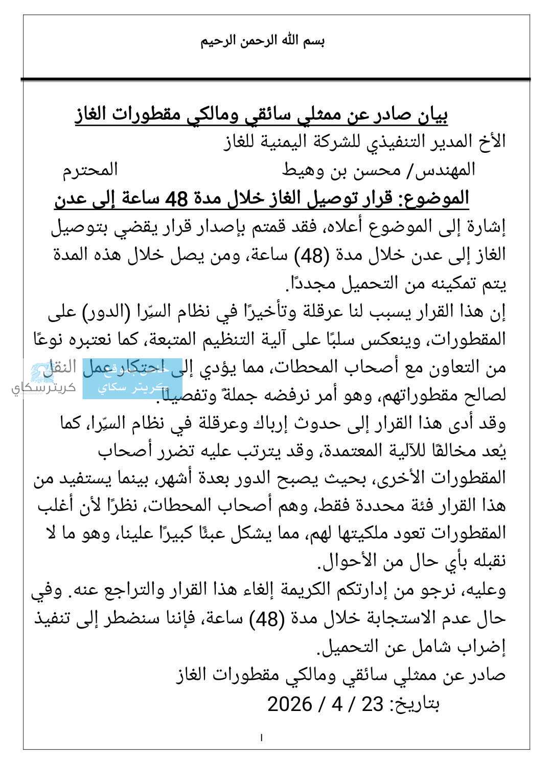 ​أصدر ممثلو سائقي ومالكي مقطورات الغاز بياناً عاجلاً موجهاً إلى المدير التنفيذي للشركة اليمنية للغاز، المهندس محسن بن وهيط، يعلنون فيه رفضهم القاطع للقرار الأخير الذي يلزم المقطورات بإيصال الغاز إلى محافظة عدن خلال مهلة زمنية لا تتجاوز 48 ساعة، مهددين بالتصعيد في حال عدم الاستجابة لمطالبهم.