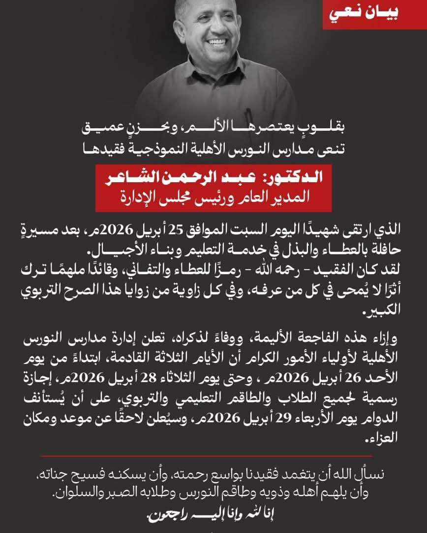 وإزاء هذه الفاجعة الأليمة، ووفاءً لذكراه، تعلن إدارة مدارس النورس الأهلية لأولياء الأمور الكرام أن الأيام الثلاثة القادمة، ابتداءً من يوم الأحد 26 أبريل 2026م وحتى يوم الثلاثاء 28 أبريل 2026م، إجازة رسمية لجميع الطلاب والطاقم التعليمي والتربوي، على أن يُستأنف الدوام يوم الأربعاء 29 أبريل 2026م.