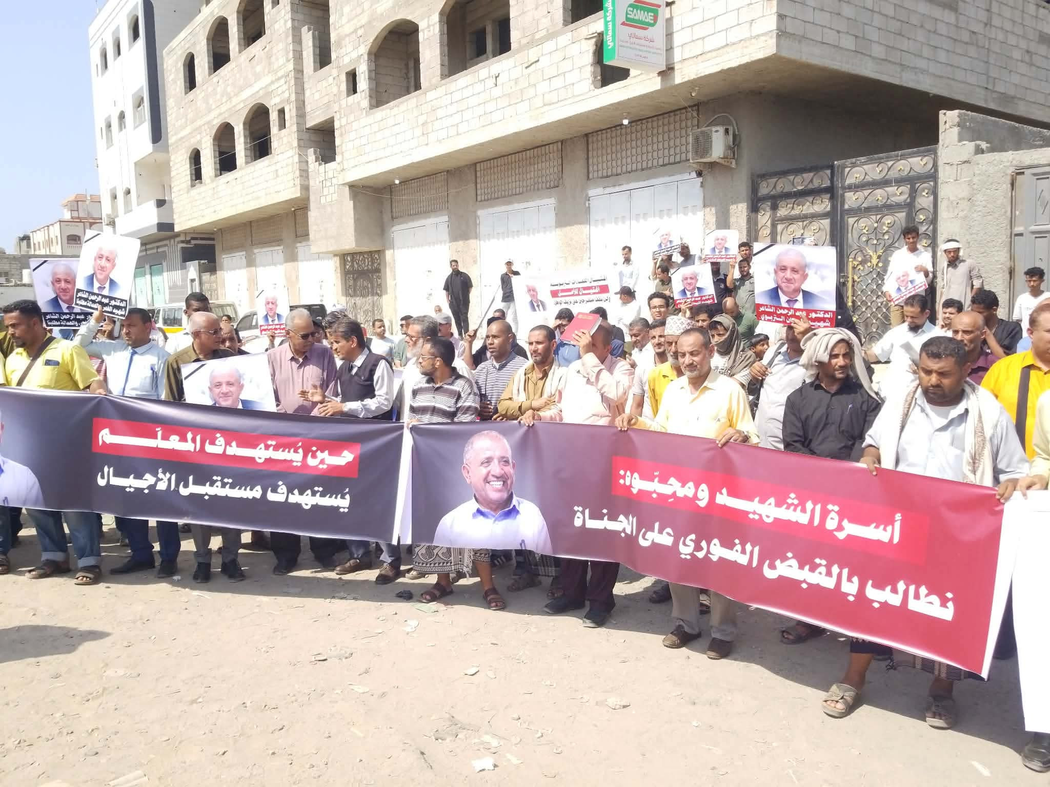 شهدت مديرية #المنصورة في العاصمة المؤقتة #عدن، صباح اليوم الأربعاء، وقفة احتجاجية نظمها معلمون وتربويون وناشطون أمام فرع مدارس "النورس" في منطقة كابوتا، تنديداً باغتيال رئيس مجلس إدارة المدارس الدكتور عبدالرحمن الشاعر، ومطالبةً بسرعة كشف ملابسات الجريمة ومحاسبة المتورطين.