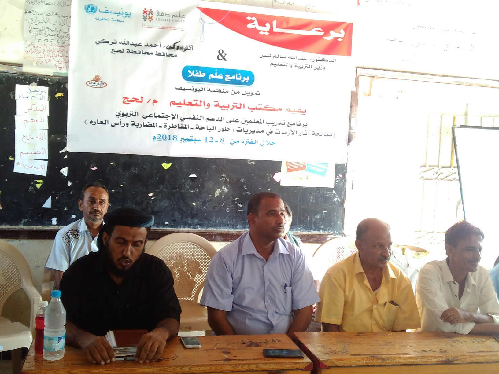 بحضور مستشار السلطة المحلية للشئون الثقافية والادبية ا.أحمد الجريو دشنا مدير عام التربية والتعليم بلحج د.محمد الزعوري ومدير تربية طورالباحة ا. خالد السحيري صباح اليوم الاحد 9 سبتمبر الدورة التدريبية المقامة بمدارس مديرية طورالباحة التي يقيمها برنامج الدعم النفسي التربوي للحالات الطارية الممؤلة من منظمة اليؤنسيف والتي تقام في 20 مدرسة من مدارس طورالباحة كغيرها من مديريات المحافظة المستهدفة من برنامج الدعم النفسي التربوي والتي تقع على خط النار كألمقاطرة والمضاربة ورأس العارة ..
