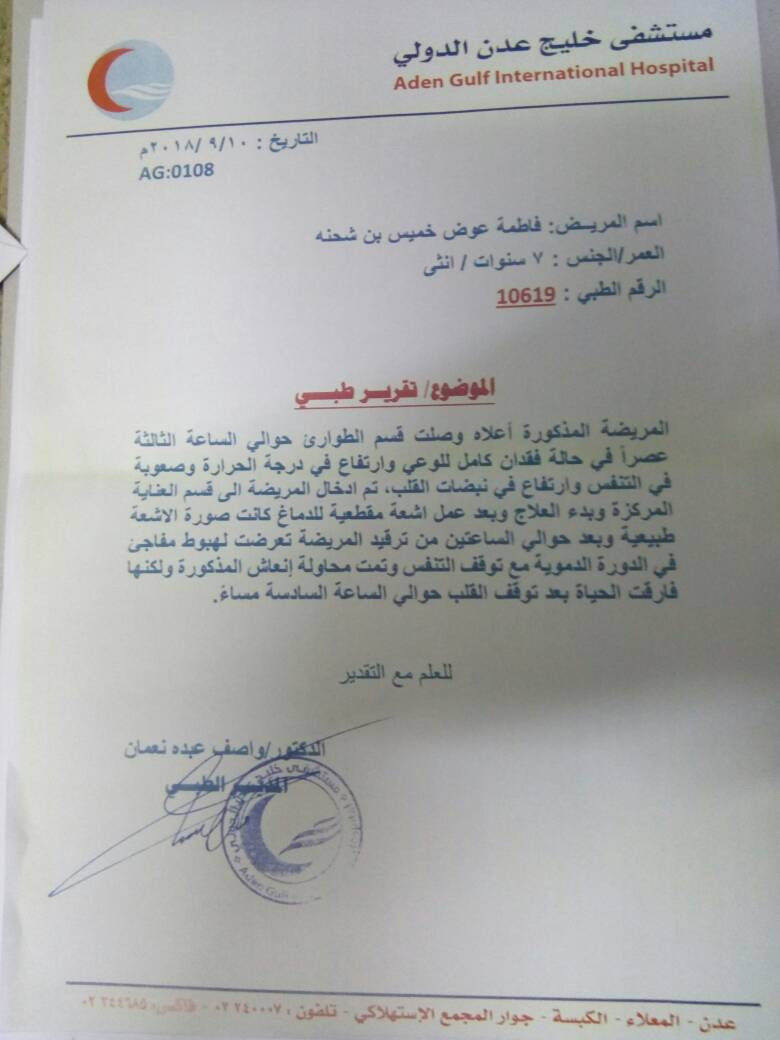 واضافت المصادر بالقول: فقالوا لوالدها ستستيظ بعد وقت قصير فاخرجها وهو حاملها وغير مدركة لشيء وذهب بها الى المنزل في المعلا وهناك استاءت الحالة وتضاعفت الاعراض فبدأت تظهر عليها الحمى الشديدة مع تصلب الاطراف وتسارع نبضات القلب وصعوبة التنفس وعدم الحركة والكلام والادراك ودخلت في غيبوبة تامة فتم نقلها إلى مستشفي خليج عدن في المعلا الساعة ٣ عصرا فحاولوا انعاشها ولكن دون جدوى وهكذا فارقت فاطمة هذه الحياة وهي في مقتبل العمر وتستعد للمدرسة نتيجة الجرعة الاضافية والاهمال وعدم وجود اسعاف اولي في المركز.