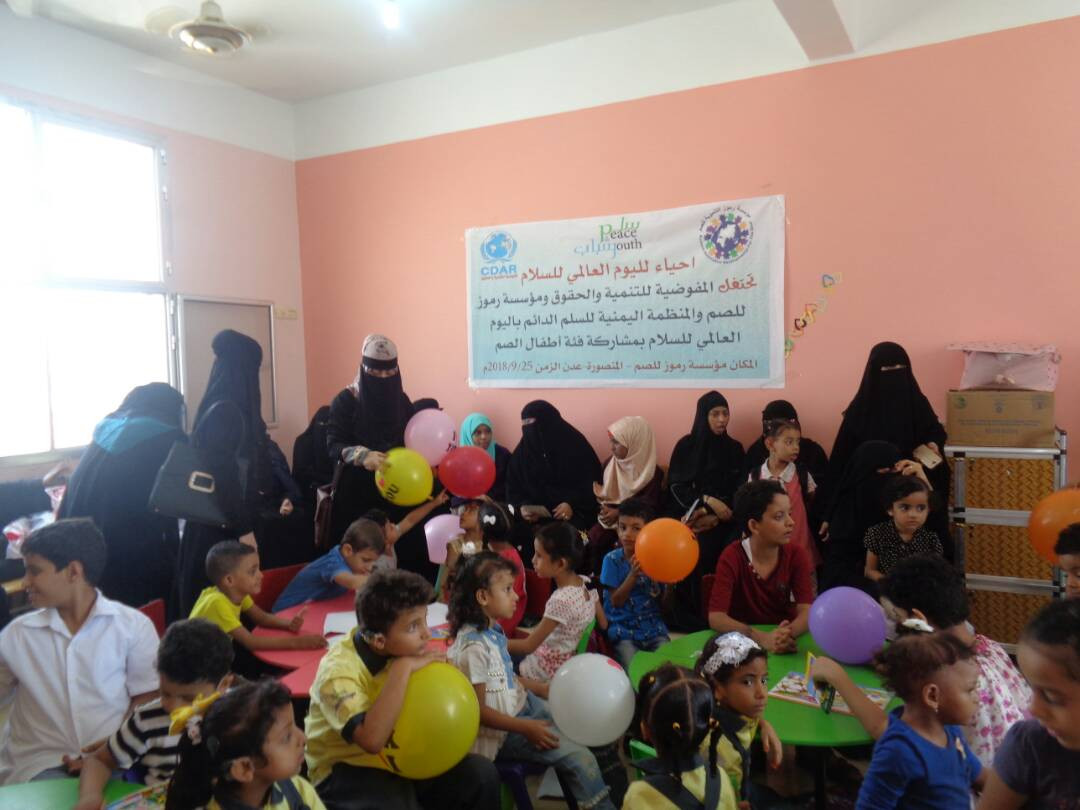 نظمت المفوضية للتنمية والحقوق بعدن اليوم ٢٥ سبتمبر ٢٠١٨م احتفالية بمناسبة اليوم العالمي للسلام بالشراكة مع مؤسسة رموز التنموية للصم والمنظمة اليمنية للسلم الدائم