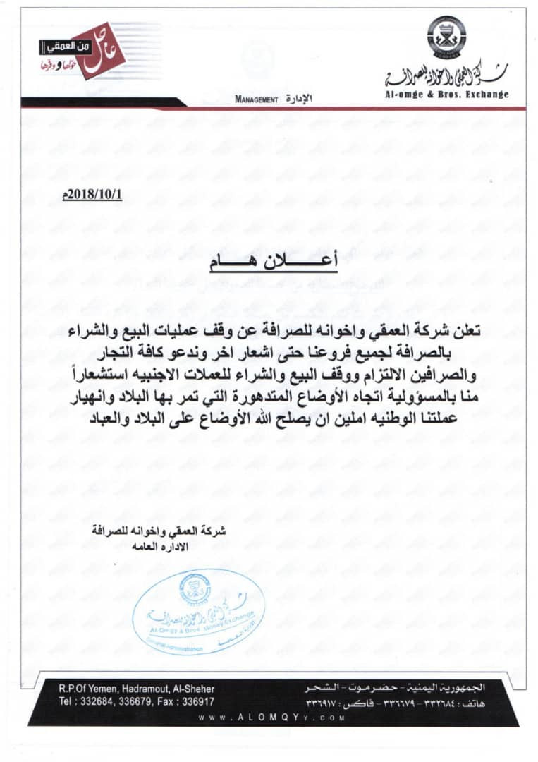 ودعت شركة العمقي وإخوانه للصرافة في إعلان لها، كافة التجار والصرافين الالتزام ووقف البيع والشراء للعملات الاجنبية.