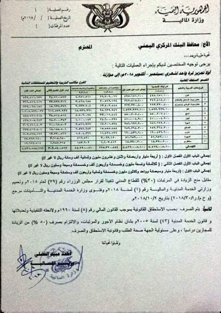 وقال لملس وزير التربية والتعليم انه تم اعتماد الزيادة بنسبة 30% في رواتب المعلمين ابتدا من شهرين سبتمبر وأكتوبر.