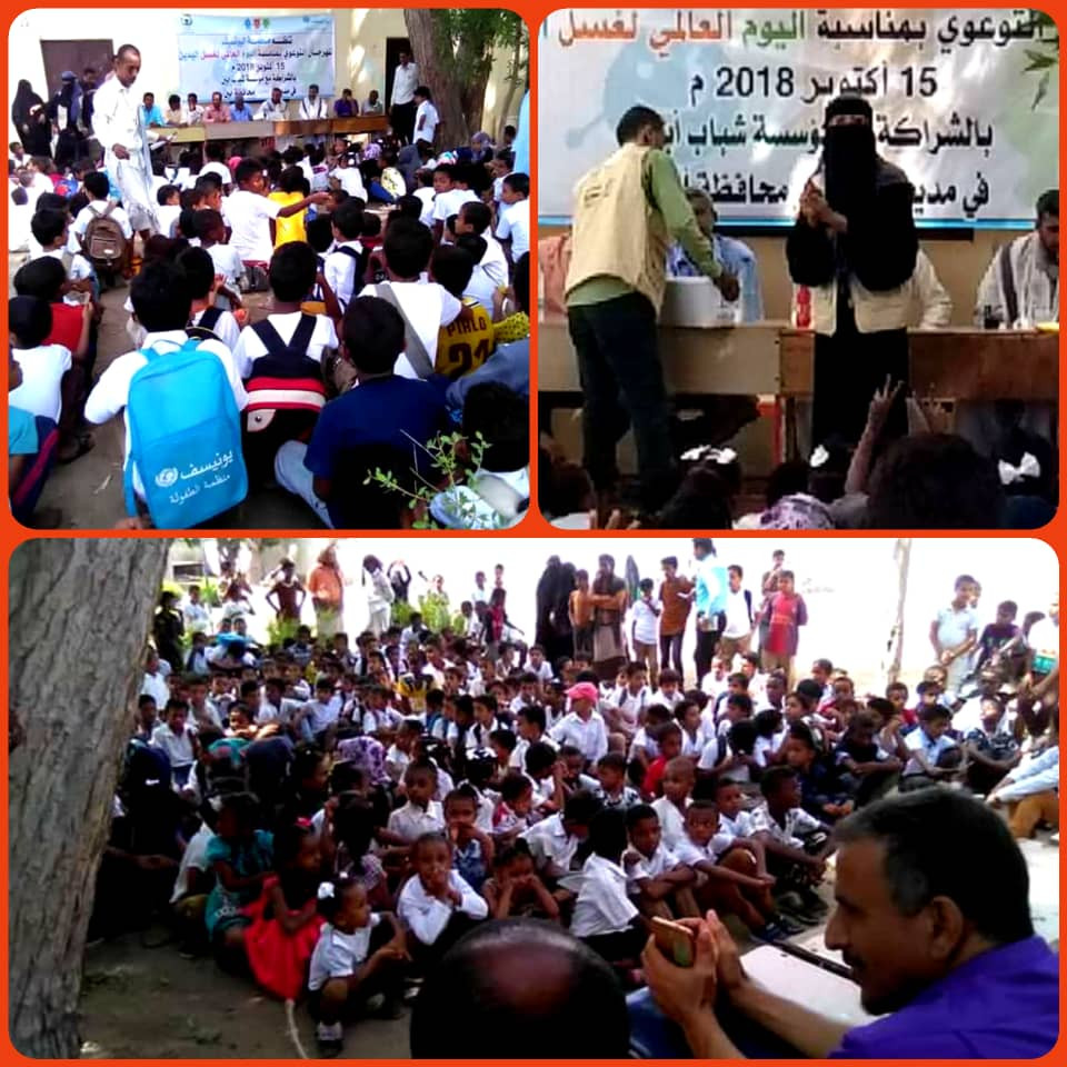 بمناسبة اليوم العالمي لغسل اليدين الموافق 15اكتوبر وفي إطار برامجها المجتمعية المتواصلة دشنت مؤسسة شباب أبين المؤسسة المجتمعية الرائدة في محافظة أبين يوم الإثنين 15اكتوبر 2018م بالشراكة مع منظمة اليونيسيف حملة توعوية واسعة في المدارس والمساحات الصديقة في إطار مديريتي خنفر وزنجبار حيث تم اليوم تدشين فعاليات مهرجان اليوم العالمي لغسل اليدين في مديرية زنجبار بحضور الأستاذ غسان شيخ مدير عام مديرية زنجبار رئيس المجلس المحلي في المديرية والأستاذ نادر احمد فضل مدير مكتب التربية والتعليم في مديرية زنجبار وعددا من الشخصيات التربوية والتعليمية والإجتماعية في المديرية.