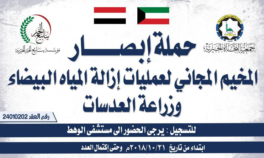 بتمويل من جمعية النجاة الخيرية بدولة الكويت، تدشن مؤسسة ينابيع الخير الخيرية المخيم المجاني لعمليات إزالة المياه البيضاء وزراعة العدسات بمحافظة لحج تحت شعار ( حملة ابصار )