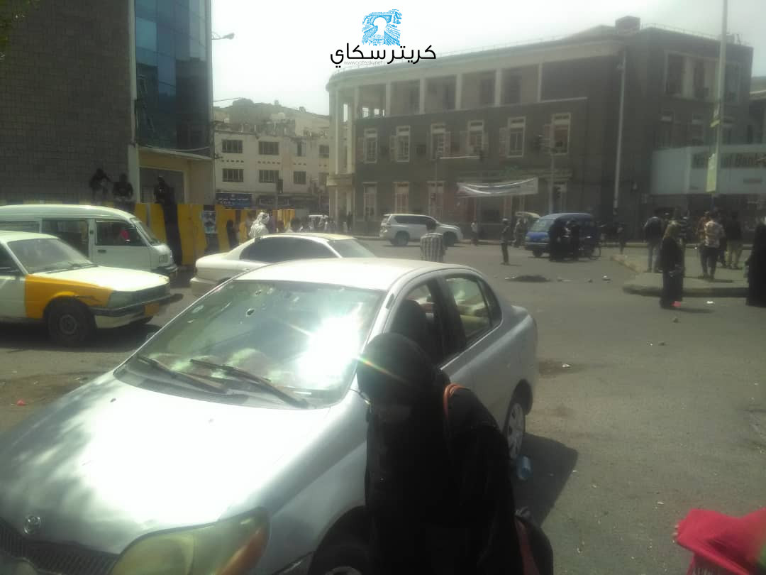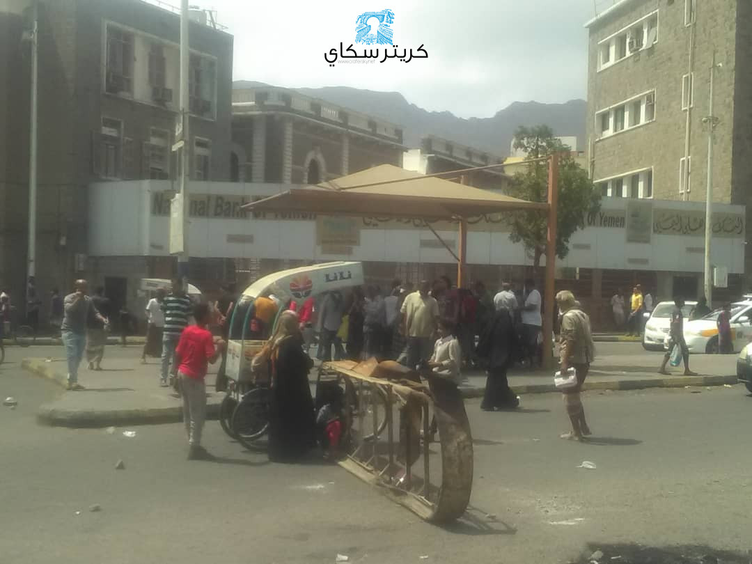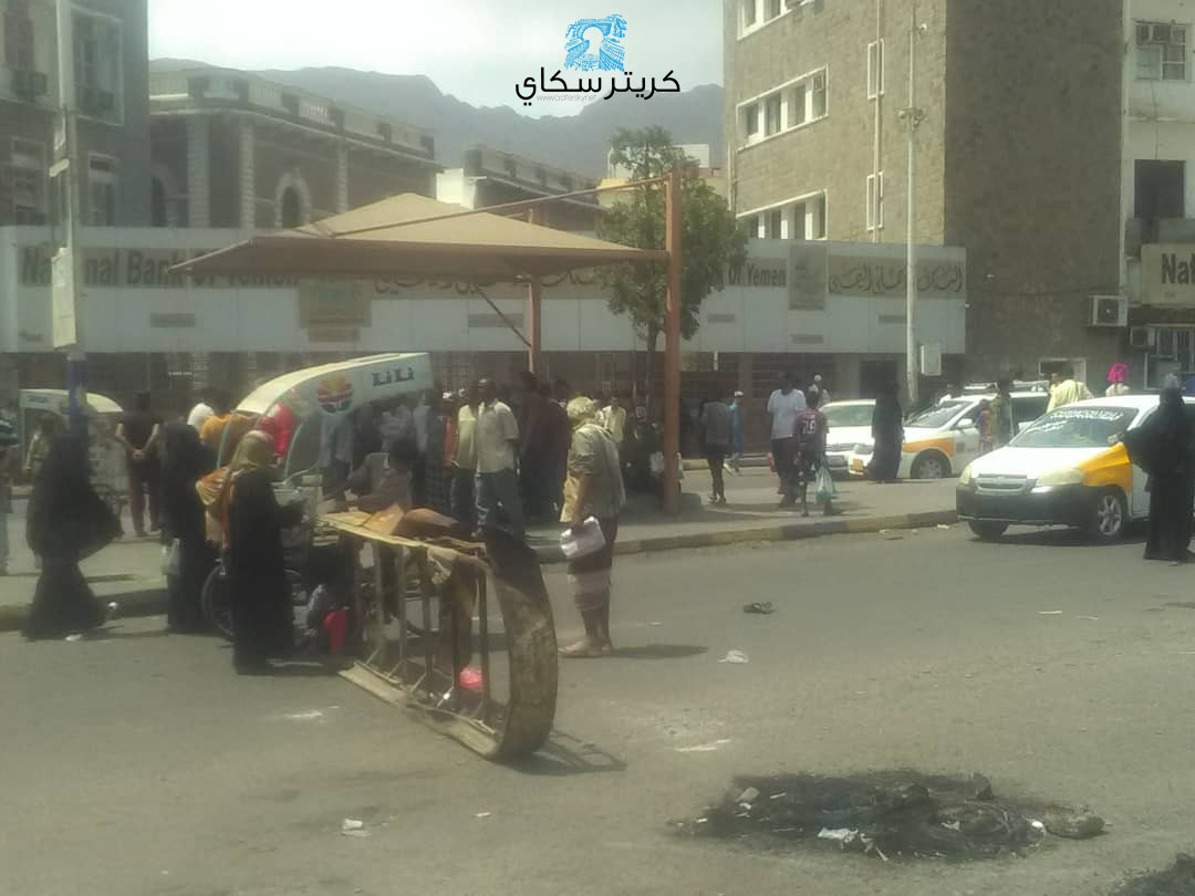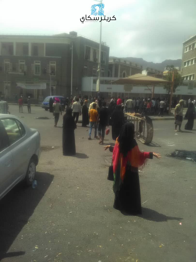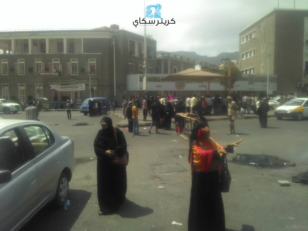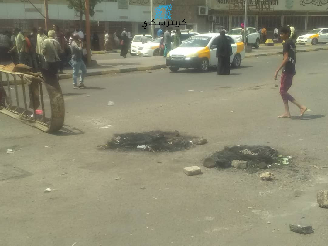 وقال مواطنون لكريتر سكاي:ان محتجين غاضبين اغلقوا شارع الملكة اروئ واضرموا النار في إطارات تالفة احتجاجا على عدم صرف مرتبات المتقاعدين والعسكريين وكافة موظفي الدولة.