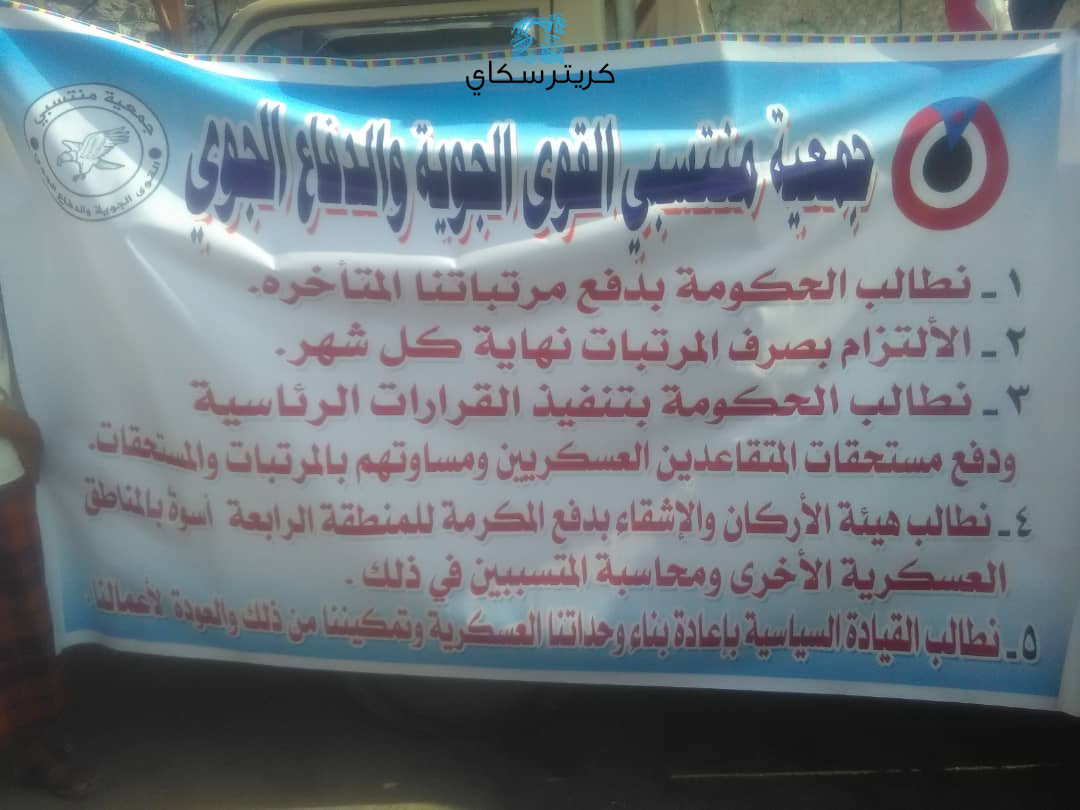 وقال مشاركون لكريتر سكاي:انهم تظاهروا للمطالبة بمستحقاتهم ابرزها صرف مرتباتهم المتوقفة منذ اشهر بانتظام كل شهر بالاضافة الى تسوية اوضاع المتقاعدين وصرف اكرامية التحالف للمنظمين للمنطقة للرابعة.