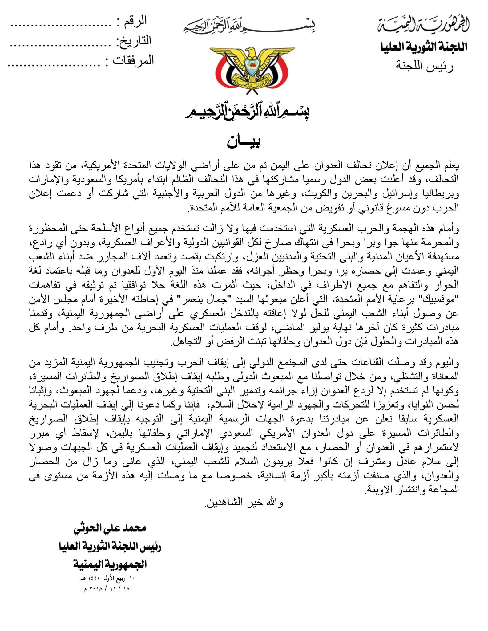 قال بيان للجماعة انهم مستعدون لتجميد وإيقاف العمليات العسكرية في كل الجبهات بغية التوصل إلى السلام.