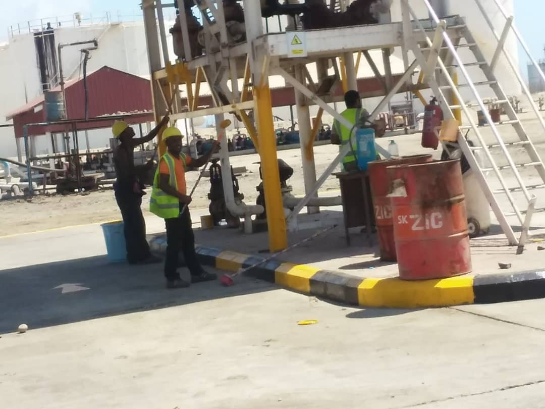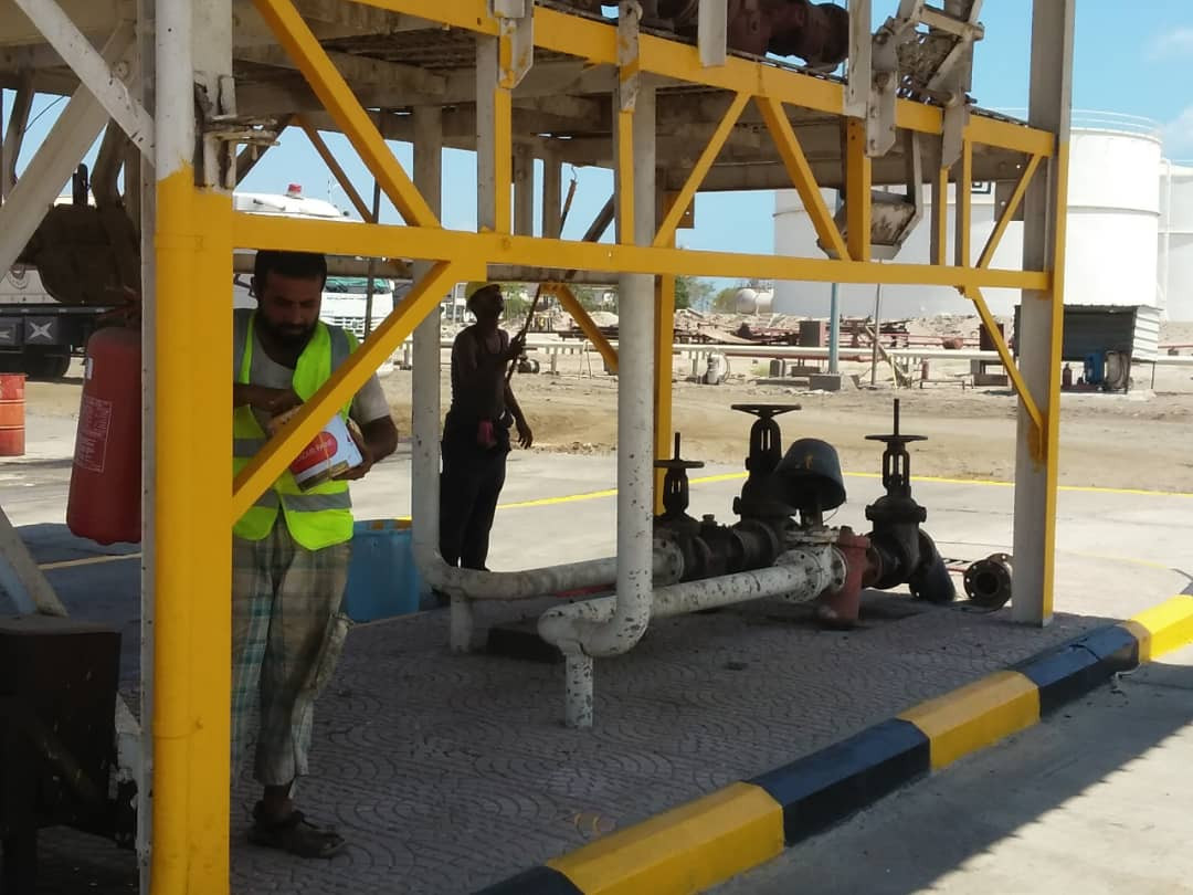يواصل فريق هندسي تابع لشركة النفط بعدن أعمال ترميم منشأة البريقة.
